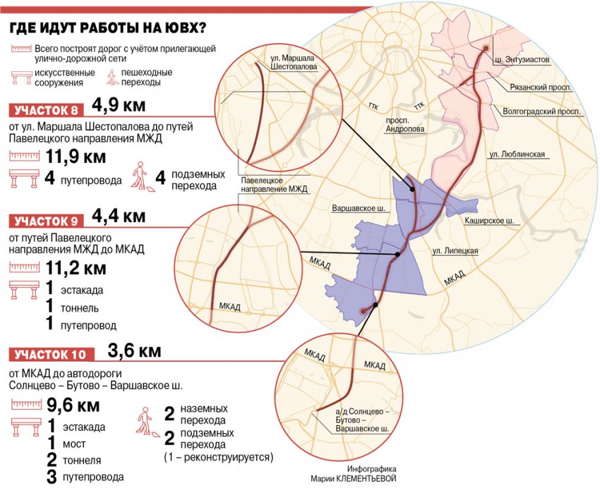 Недавно заместитель мэра Москвы по вопросам градостроительной политики и строительства Андрей Бочкарёв сообщил, что строительная готовность 8-го участка Юго-Восточной хорды (ЮВХ) от ул. Маршала Шестопалова до Павелецкого направления МЖД составляет 54%.