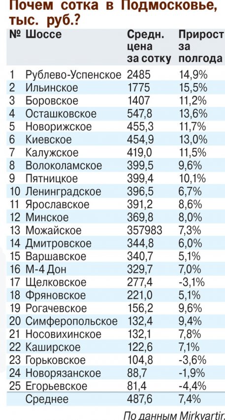 Восток и юго-восток области, как всегда, оказались самыми доступными. Средняя сотка на Егорьевском шоссе — аутсайдере списка — оказалась дешевле рублевской ровно в 31 раз. Чуть дороже оцениваются участки на Новорязанском и Горьковском шоссе.
