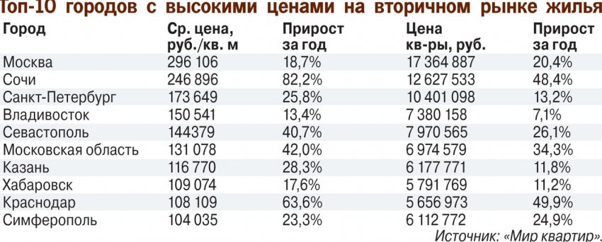 В минувшем году самый большой прирост цены квадратного метра показали квартиры в Сочи (+82,2%) и Краснодаре (+63,6%). «С установлением в этих городах моратория на новое строительство цены на первичном рынке стали неконтролируемо расти, поэтому спрос обратился ко «вторичке», и там тоже начался схожий процесс», — объяснил ситуацию гендиректор портала «Мир квартир» Павел Луценко.